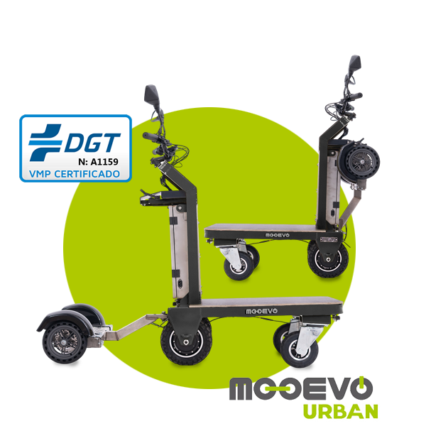 Carro y patinete eléctrico de reparto urbano dual para uso en calzada y acera. Ideal para repartir mensajería y paquetería. Plegable para poder ir andando o desplegado para utilizarse como vehículo eléctrico de movilidad personal, gracias al exclusivo Sistema DUAL de MOOEVO .