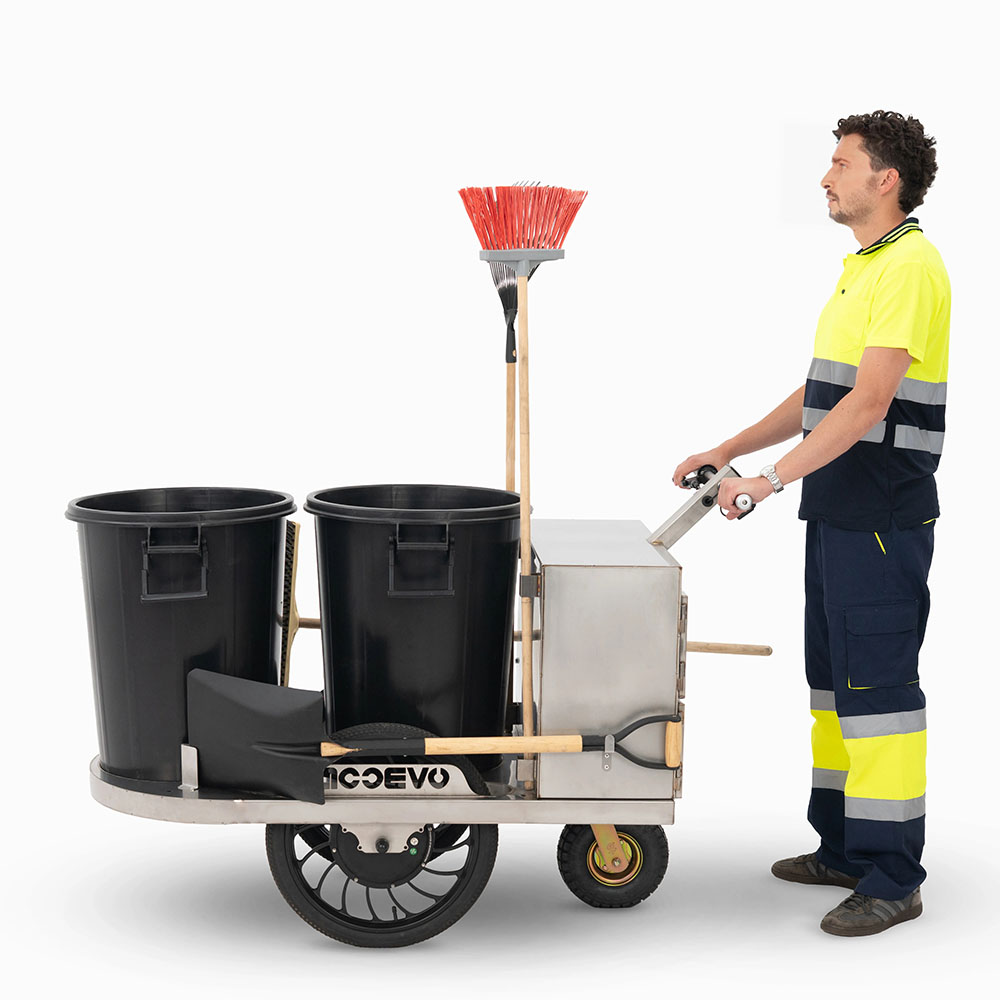 MOOEVO CLEAN PRO es un carro eléctrico de limpieza viaria y recogida urbana de residuos para barrenderos y personal de mantenimiento, que asiste el movimiento del carro y su carga para trabajar con menos esfuerzo y mayor eficiencia.