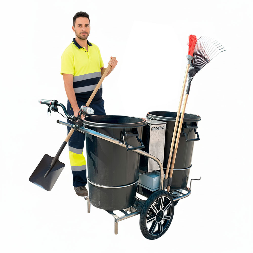 Carrito eléctrico de limpieza urbana MOOEVO CLEAN LITE, diseñado para hacer más eficiente y cómoda la labor diaria de los operarios municipales o privados. Su sistema de asistencia eléctrica reduce el esfuerzo físico, mejora la movilidad y permite cubrir más superficie en menos tiempo.